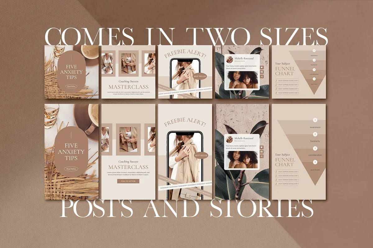 Elegant Instagram Coach Bundle for CANVA, featuring Instagram Posts, Stories, Carousels and Pinterest pins. Perfect for coaches, course creators, service providers and business owners who want to establish themselves as an industry leader in their niche, grow their Instagram account and nurture their existing audience with share-worthy, engaging and educational content.